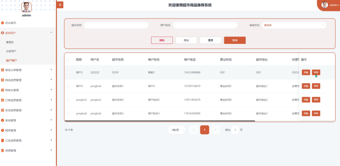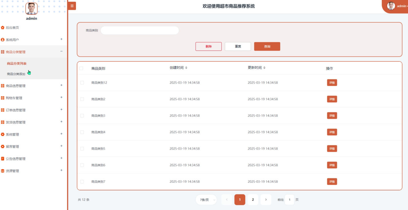 "Supermarket Commodity Recommendation System Based on Apriori Algorithm" is developed in Python language, uses Flask framework to build back-end services, and combines MySQL database to achieve data storage and management. The system analyzes the customer's shopping basket data to mine the mix of frequently purchased products, so as to provide users with personalized product recommendation services. As the core association rule learning method, the Apriori algorithm can efficiently identify the collection of goods that are frequently purchased together (i.e., the frequent item set) and generate recommendation suggestions based on these findings. The front-end of the system provides a variety of functional modules for different types of users, including product browsing, shopping cart management, order tracking for registered users, product information maintenance and review management for merchant users, and comprehensive background management functions for administrators, such as user management, product classification management, order information management, etc.