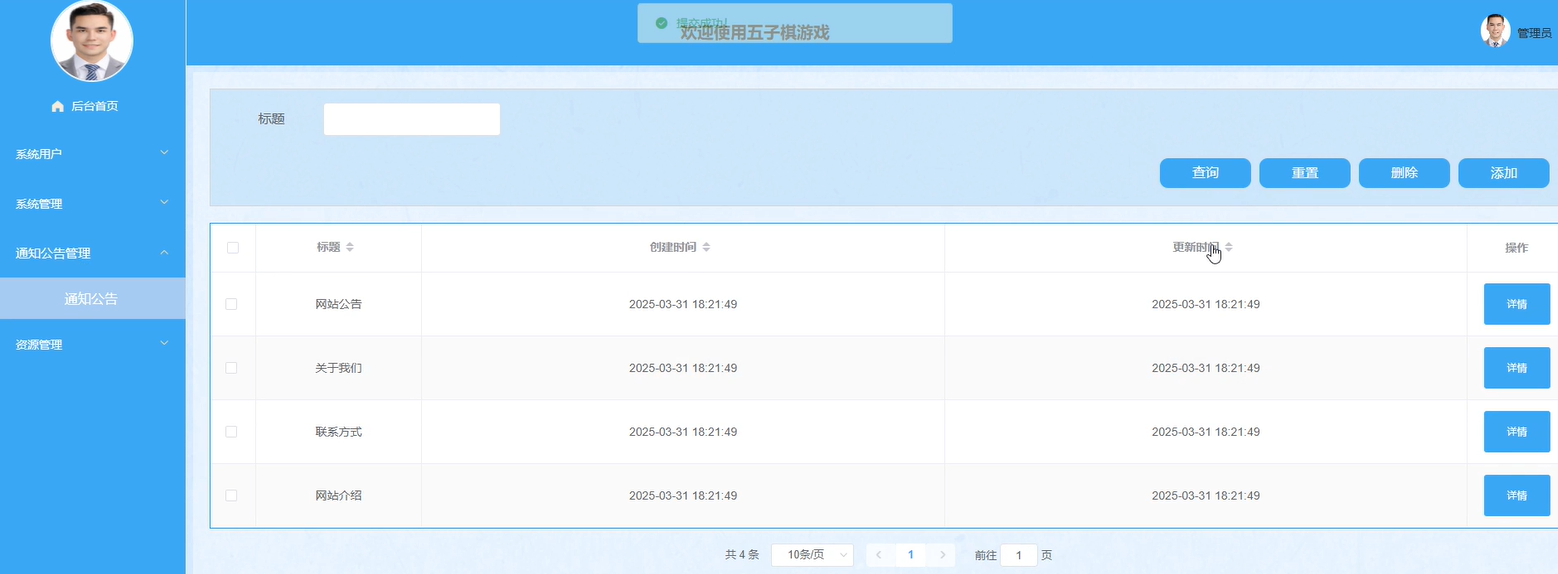 通知公告管理:主要管理通知公告。支持添加、编辑、查询、删除、查看详情操作。通知公告列表界面如下图所示。