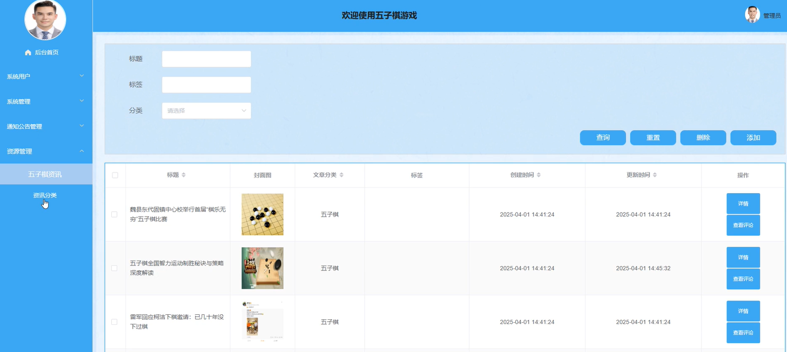 (7)资源管理:包含五子棋资讯跟资讯分类。五子棋资讯:管理员可以添加新的五子棋资讯,并可以进行删除、编辑、查看详情、查看评论等操作。资讯分类:主要管理资讯分类,可进行添加、删除、修改、查看详细信息等操作。