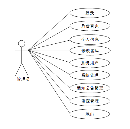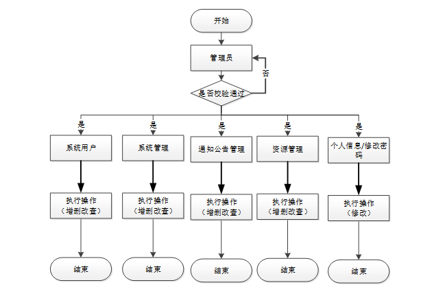 管理员包含登录、管理系统用户、系统管理、通知公告管理、资源管理的增删改查等功能,管理员业务流程图如图所示: