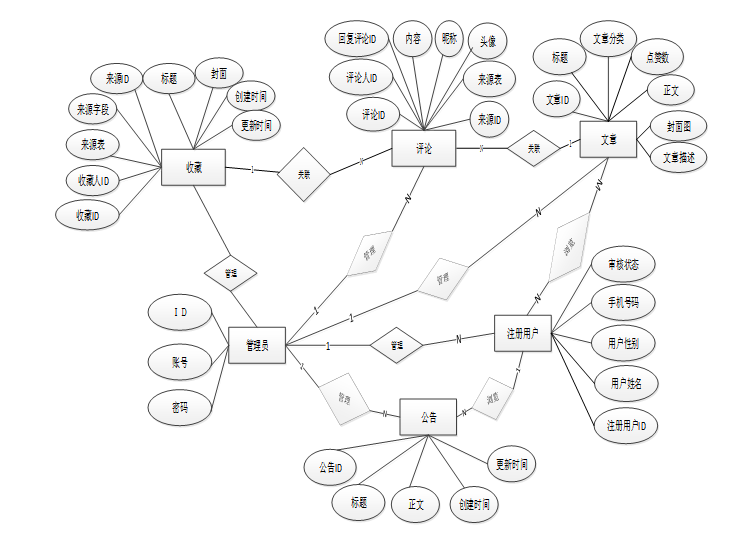 基于微信小程序的五子棋游戏中管理员、注册用户、五子棋资讯(文章)、 评论、收藏等E-R实体关系图