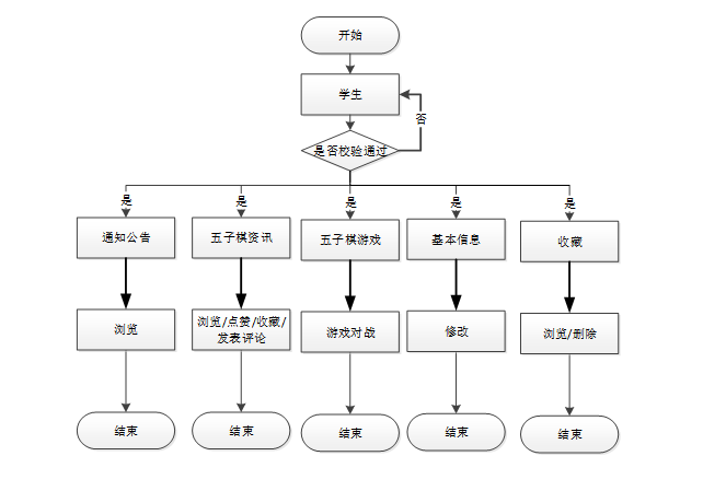 注册用户浏览通知公告、五子棋资讯、五子棋游戏、基本信息、收藏等功能,管理员业务流程图如图所示:
