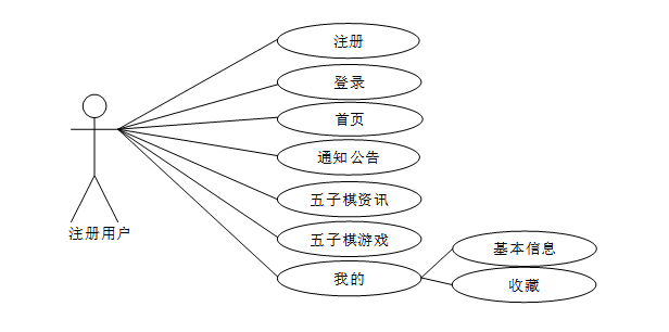 基于微信小程序的五子棋游戏中注册用户包含注册、登录、首页、通知公告、五子棋资讯、五子棋游戏、基本信息、收藏等功能。注册用户用例图如下所示: