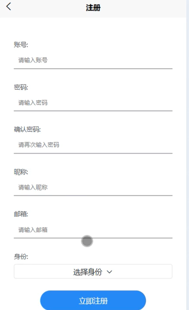 (2)用户注册:首先点击“注册”按钮,输入账号、密码、确认密码、昵称、邮箱、选择身份:注册用户、用户姓名、用户性别、手机号码等信息,点击立即注册按钮,注册成功后才能进行登录。