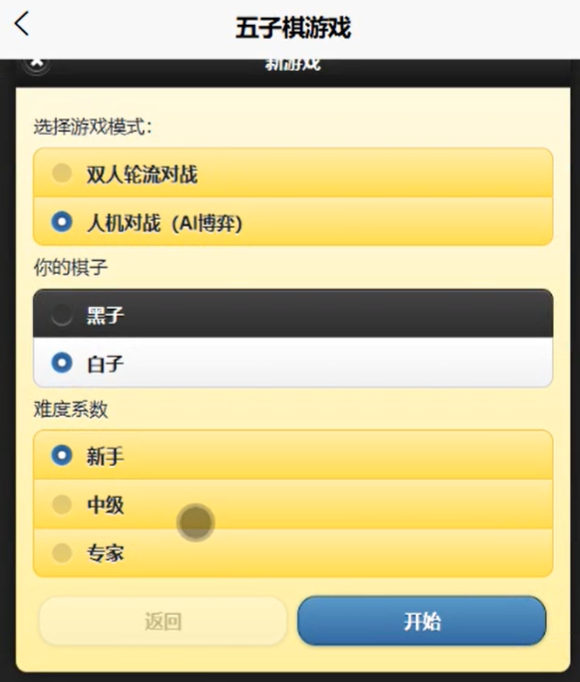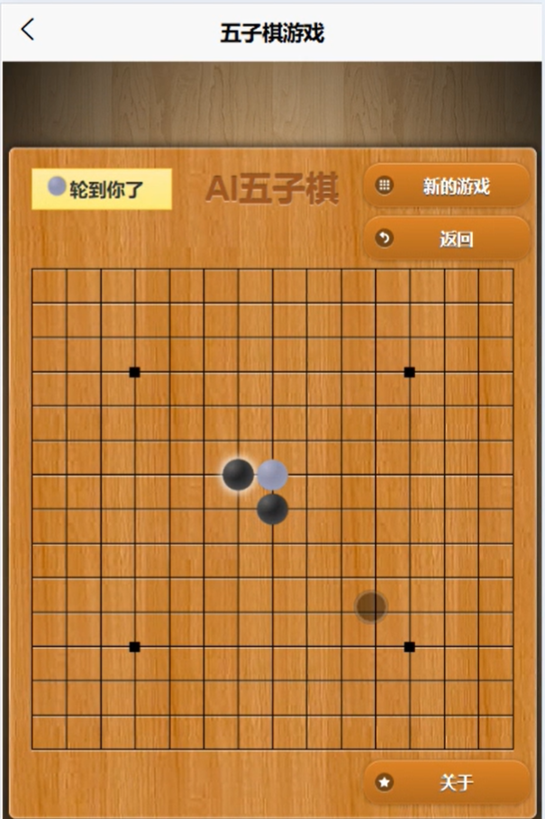 (6)五子棋游戏:注册用户可以选择游戏模式:双人轮流对战和人机对战(AI博弈),选择执棋颜色(黑白)以及难度系数(新手、中级、专家)。选择好后点击开始即可进行游戏。在游戏过程中轮到你下棋时会提示轮到你了,当快要连成五子时也会红色点提示。在游戏过程中你可以点击返回,回到游戏选择页面,点击新的游戏可以开启新的一轮游戏,点击关于可游戏规则等。输了会提示输了并提示是否继续挑战。点击返回,回到游戏选择页面,点击继续挑战可以开启新的一轮游戏。
