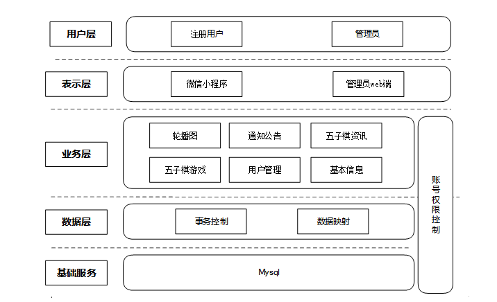 基于微信小程序的五子棋游戏采用了层次结构设计,从上至下依次为用户层、表示层、业务层、数据层和基础服务。用户层包括注册用户和注册用户示层利用HTML、CSS和JavaScript技术构建用户界面。业务层则专注于处理核心业务,例如轮播图、系统用户管理、公告处理、五子棋资讯管理、基本信息处理等。数据层负责事务控制和数据映射,并利用MySQL作为基础服务来实现高效的数据存储和访问。整个系统的层级结构清晰明了,各组件之间的相互作用和依赖关系一目了然。