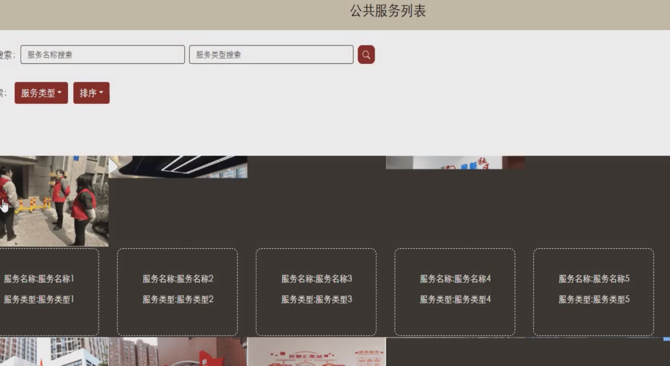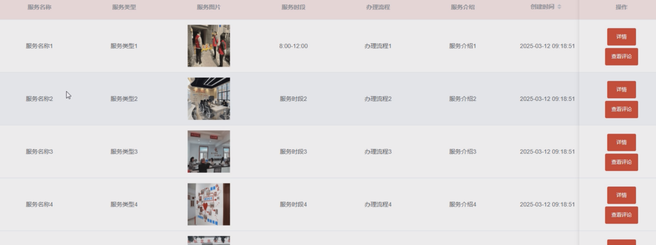 用户可以浏览公共服务列表, 支持服务类型搜索;点击可查看详情,包含名称、类型、服务时段、办理流程、服务介绍、服务详情等相关信息;可以对服务信息进行点赞、收藏、评论、在线预约等操作;预约信息包含服务类型、服务时段、用户姓名、预约时间、预约备注等信息;提交预约后需管理员进行审核。公共服务界面展示如图5-4所示。