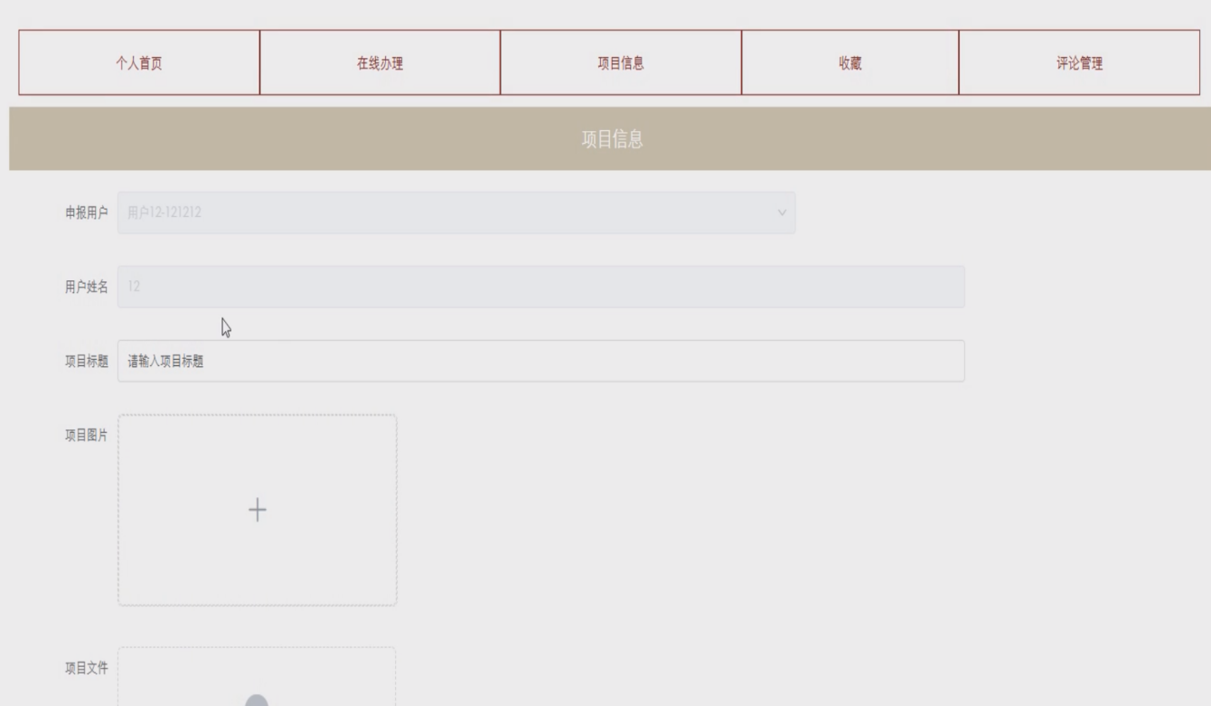 - 个人中心:包含在线办理(查看在线预约信息及审核状态)、项目信息(查看项目信息详情及可进行查询、重置、添加、删除等操作,项目信息包含申报用户、用户姓名、项目标题、项目图片、项目文件、项目介绍、预算情况、申报时间、审批状态等相关信息,提交项目申请后需等待审批)、评论管理(用户可查看评论列表、评论信息、评论回复及删除操作)、收藏(可查看收藏的相关信息及删除收藏)。