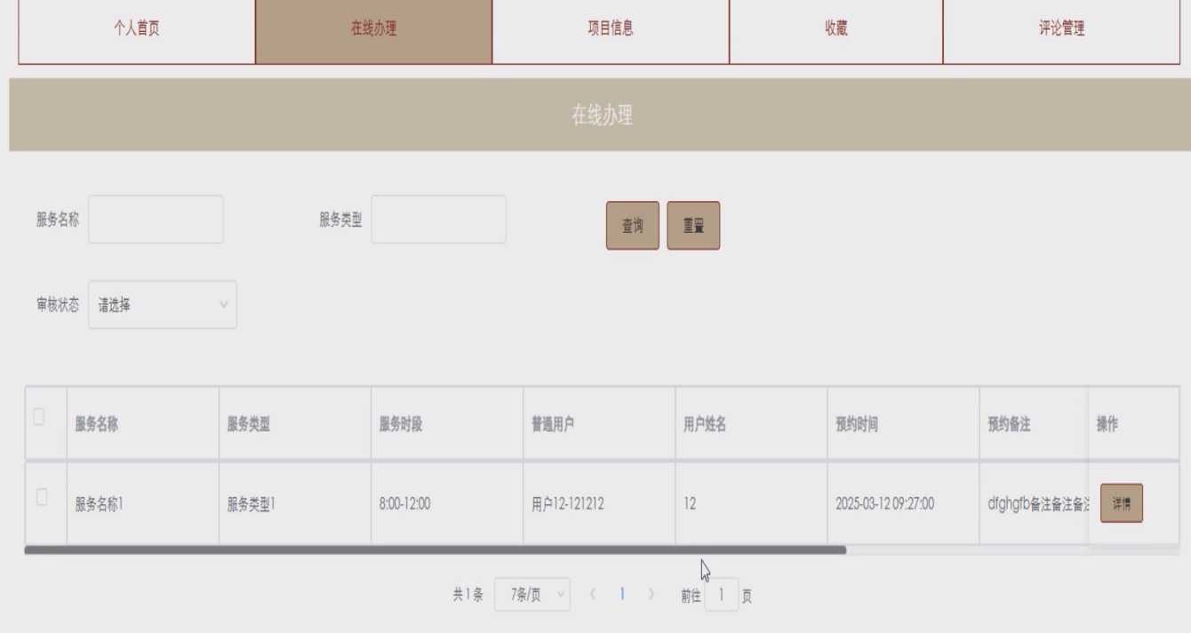 个人中心:包含在线办理(查看在线预约信息及审核状态)、项目信息(查看项目信息详情及可进行查询、重置、添加、删除等操作,项目信息包含申报用户、用户姓名、项目标题、项目图片、项目文件、项目介绍、预算情况、申报时间、审批状态等相关信息,提交项目申请后需等待审批)、评论管理(用户可查看评论列表、评论信息、评论回复及删除操作)、收藏(可查看收藏的相关信息及删除收藏)。在线办理、项目信息界面展示如图5-6、5-7所示。