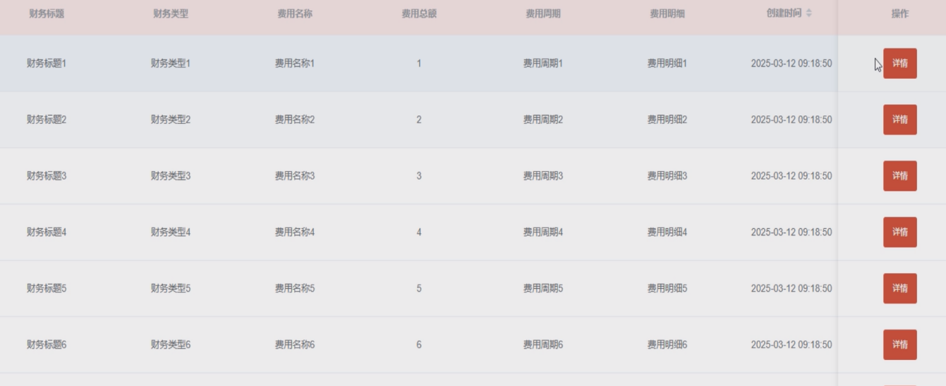 管理员可查看财务信息列表,可以创建新的财务信息名称,包含类型、标题、名称、总额、明细、周期等相关信息。财务信息管理界面如图5-11所示。