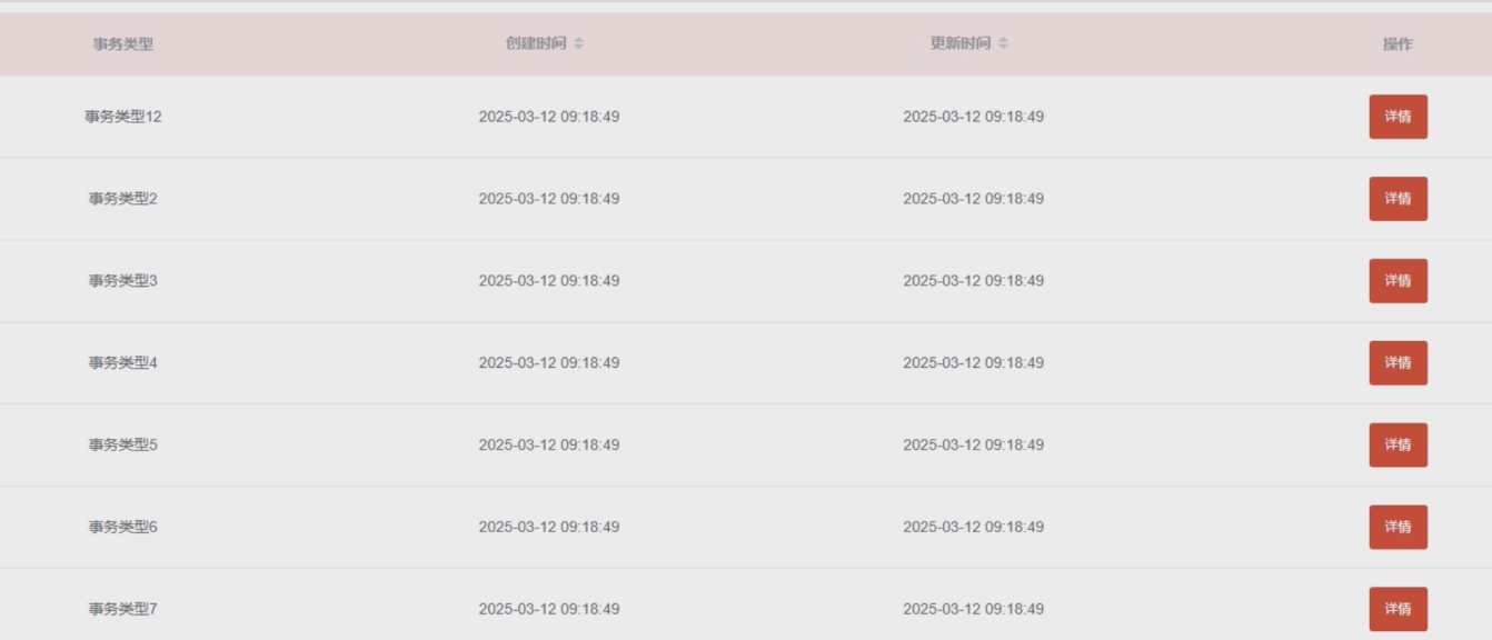 管理员可查看事务分类列表,可以创建新的事务类型,编辑或删除现有的类型。界面展示如图5-9所示。