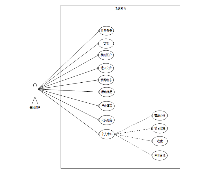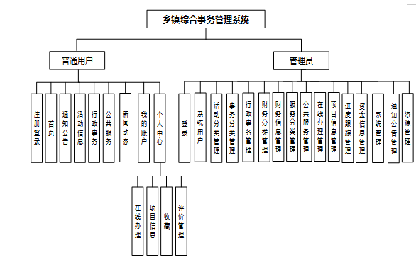 乡镇综合事务管理系统设计分为两个主要用户角色:普通用户和管理员。以下是对每个角色的功能需求的详细描述。