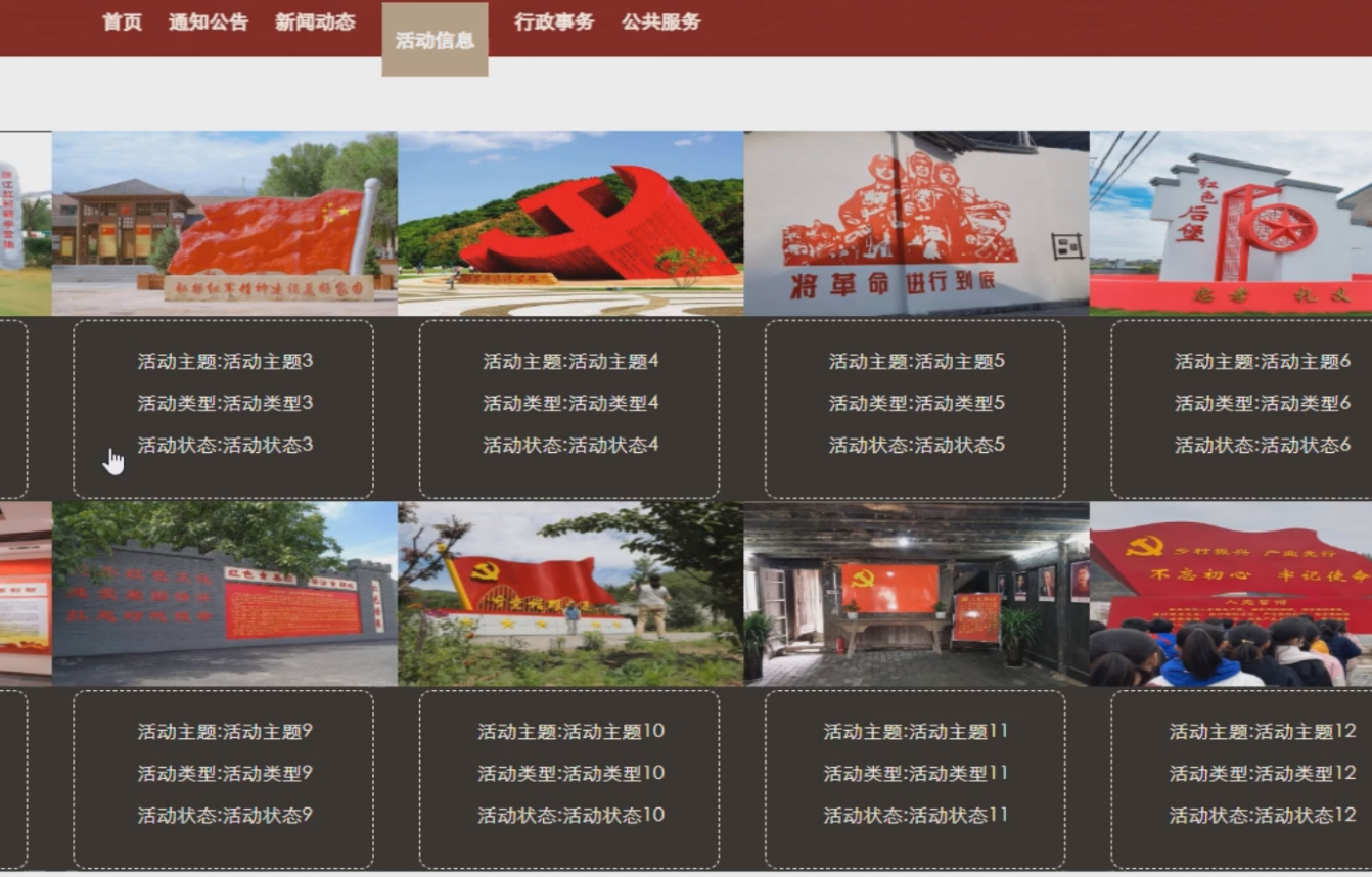 - 活动信息:用户可以浏览活动列表,查看具体的活动信息,包括主题、类型、状态、举行地点、时间、简介等相关信息,可以对活动信息进行点赞、收藏和评论等操作。