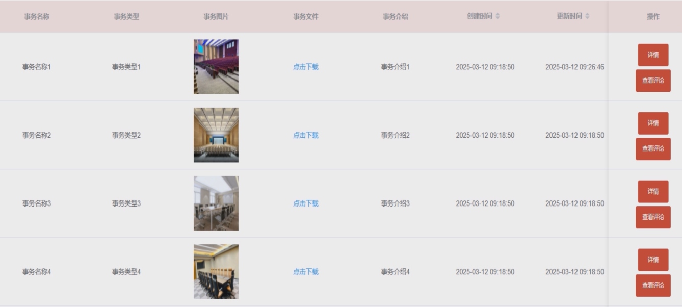 管理员可查看行政事务列表及点击下载文件,可以创建新的行政事务类型,编辑或删除现有的类型。事务包含类型、图片、文件、介绍、详情等相关信息。行政事务管理界面如图5-10所示。