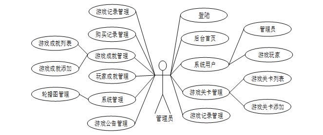 在基于微信小程序的开心消消乐游戏中,管理员用例图展示了管理员在系统中可以执行的主要操作,包括用户管理、游戏关卡管理、道具商店管理、购买记录管理、游戏成就管理、内容更新(如公告和轮播图管理)、以及系统配置等功能。