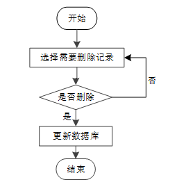 用户首先选择需要删除的记录,然后系统判断是否执行删除操作。如果用户选择不删除,则返回重新选择;如果选择删除,则更新数据库完成记录删除操作,最后结束流程。如图3-5-4所示。