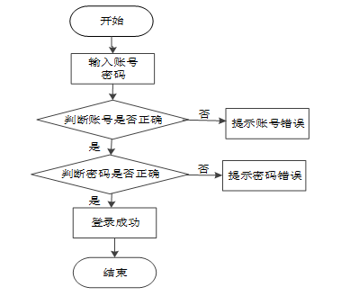 用户输入账号和密码后,系统首先判断账号是否正确,若不正确则提示“账号错误”;如果账号正确,则继续判断密码是否正确,若密码错误则提示“密码错误”;若账号和密码均正确,则显示“登录成功”,最后结束流程。如图3-4-2所示。
