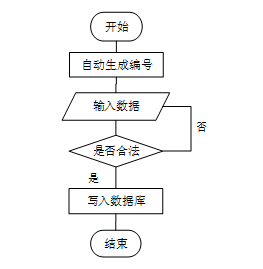 系统开始后自动生成编号,用户输入数据。系统判断输入的数据是否合法,若不合法则返回重新输入;若合法,则将数据写入数据库,最后结束流程。如图3-4-3所示。