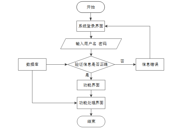 用户从“系统登录界面”开始,输入用户名和密码后,系统验证其信息是否正确。如果验证通过,则进入功能界面并进一步进入功能处理界面,最后流程结束;如果验证失败,则显示“信息错误”,用户需要重新输入。数据库支持验证过程。如图3-4-1所示。
