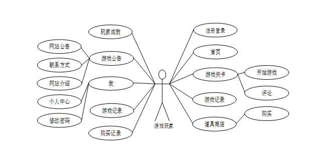 系统功能需求包括玩家和管理员两大角色,分别提供不同的功能模块。玩家可以通过注册登录系统,浏览首页、参与游戏关卡、购买道具、查看成就和评论等功能,享受全面的游戏体验,同时通过个人中心管理个人信息、查看购买记录及修改密码。管理员则通过后台系统进行用户管理、游戏关卡管理、道具商店管理、购买记录管理等操作,同时负责系统公告、轮播图和玩家成就等内容的更新与维护,确保游戏系统的稳定运行。整体系统设计为玩家提供丰富的游戏互动体验,并为管理员提供高效的管理工具。每个角色对应的主要功能如下: