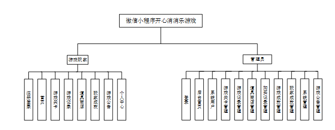 微信小程序的开心消消乐游戏的功能模块包括游戏玩家和管理员两大角色功能。游戏玩家模块涵盖注册登录、游戏关卡管理、道具商店购买、游戏记录与成就管理、评论与互动、个人中心功能,帮助玩家享受丰富的游戏体验并管理个人信息。管理员模块则包括系统用户管理、游戏关卡管理、道具商店管理、购买记录管理、游戏成就管理、公告与内容更新管理等功能,确保平台数据的有效管理与游戏的顺利运营。每个角色对应的功能模块如图所示。每个角色对应的功能模块如图所示: