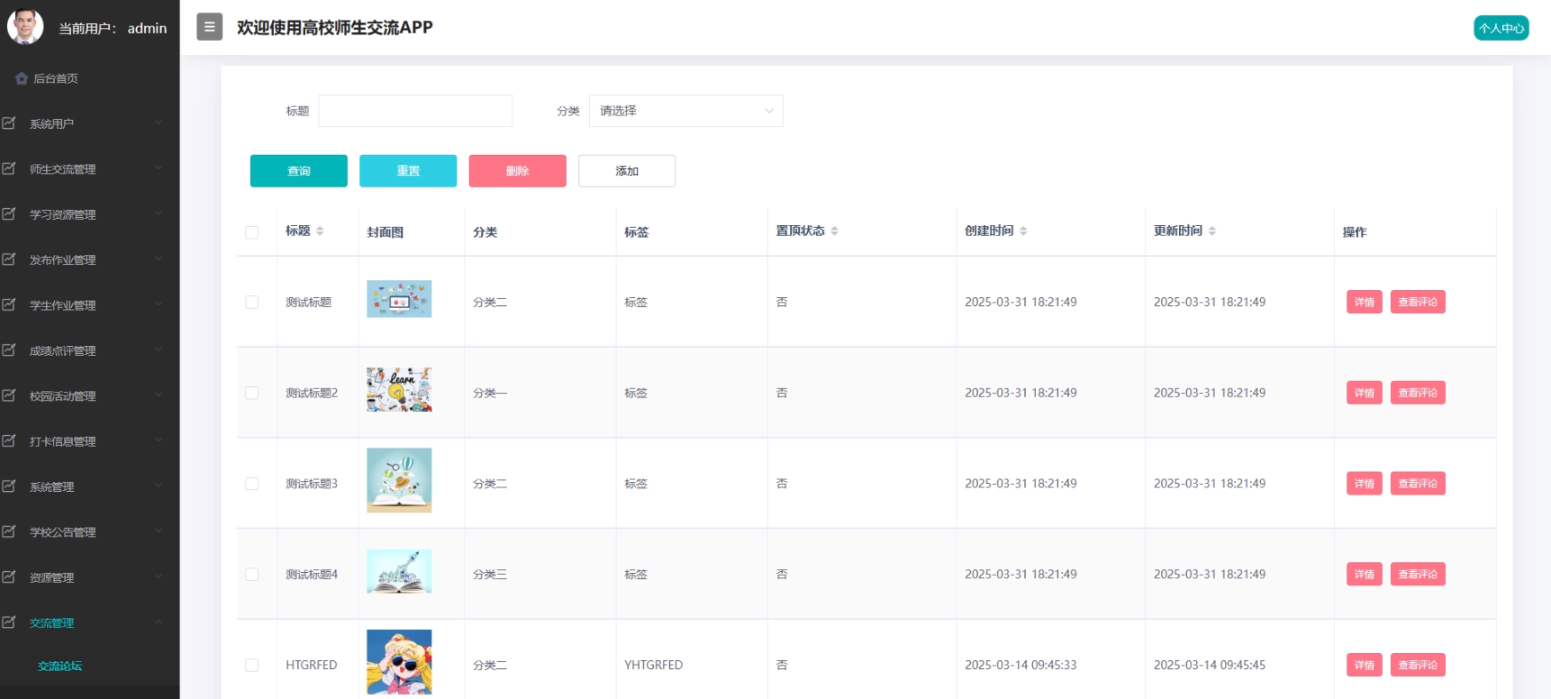 在该模块管理员可以对交流论坛和论坛分类信息进行增删改查操作。例如,点击“交流论坛”进入页面可以查看列表中某个交流论坛的详情和评论,选择某个或多个论坛信息后点击“删除”并确定删除即可删除论坛信息。以交流论坛为例,其界面如图5-17所示。