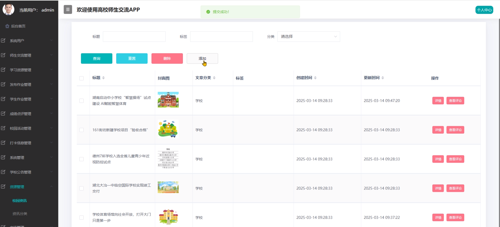 在该模块管理员可以对校园资讯和资讯分类信息进行增删改查操作。例如,点击“校园资讯”进入页面可以查看列表中某个校园资讯的详情和评论,选择某个或多个校园资讯后点击“删除”并确定删除即可删除校园资讯。以校园资讯为例,其界面如图5-16所示。