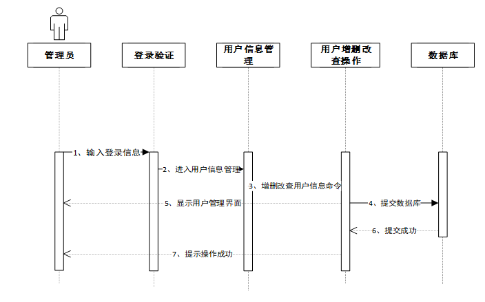 管理员输入登录信息后,进入用户信息管理模块,选择增删改查操作并提交命令至数据库。数据库执行操作后返回成功状态,系统显示用户管理界面并提示操作成功。管理员修改用户信息时序图如图4-4所示。