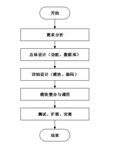 系统开发流程的主要步骤,从需求分析到系统完成的全过程。流程包括需求分析、总体设计(功能、数据库)、详细设计(模块、编码)、模块整合与调用,以及测试、扩展和完善,最终完成系统的开发。本系统的开发流程如图3-4所示