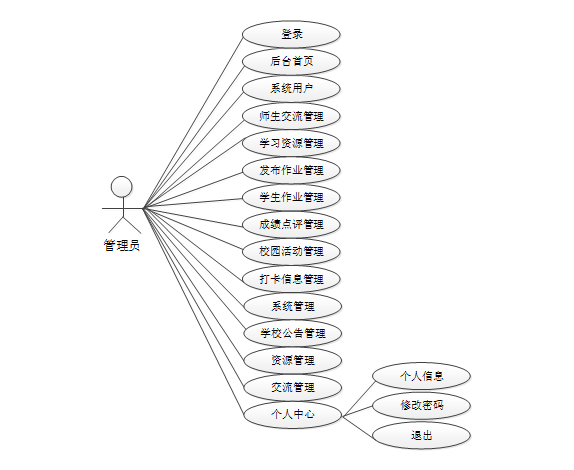 管理员功能包括登录、后台首页、系统用户、师生交流管理、学习资源管理、发布作业管理、学生作业管理、成绩点评管理、校园活动管理、打卡信息管理、系统管理、学校公告管理、资源管理、交流管理、个人中心(个人信息、修改密码、退出)。