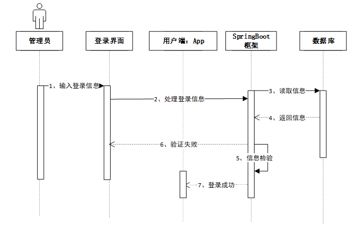 管理员输入登录信息后,登录界面将信息传递至前台管理界面,随后通过SpringBoot框架读取数据库中的用户信息并返回。系统验证信息,若验证成功则登录成功,若验证失败则返回错误提示。登录时序图如图4-3所示。