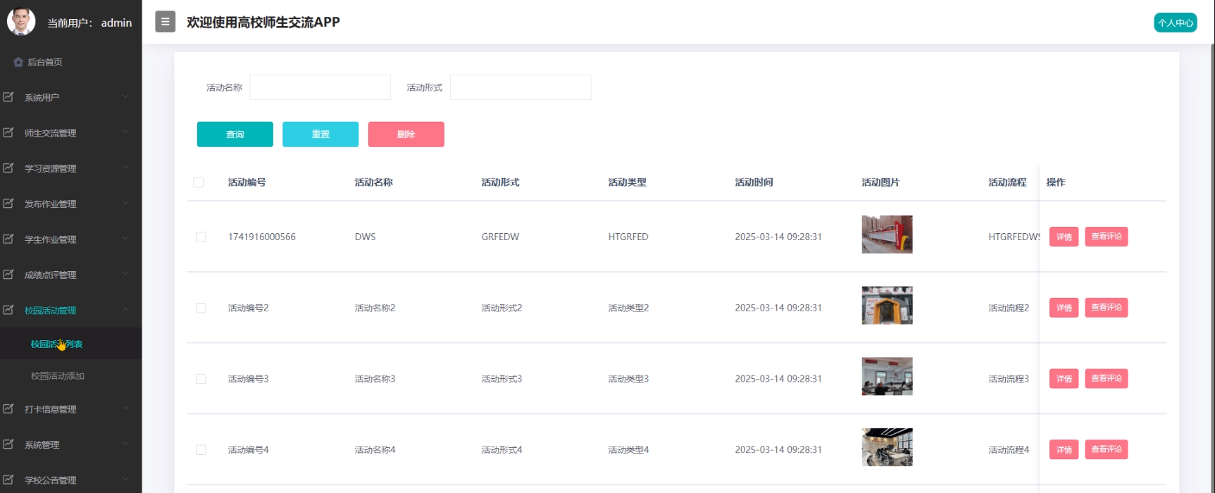 在该模块管理者可以对校园活动列表进行管理和进行校园活动添加。如点击“校园活动列表”进入页面可以查看列表中某个校园活动的信息详情和评论;可以对列表信息进行查询、重置和删除操作。点击“校园活动添加”进入页面填活动名称、活动形式等信息及上传活动图片后点击“提交”即可完成活动信息的添加。以校园活动列表为例,其界面如图5-13所示。