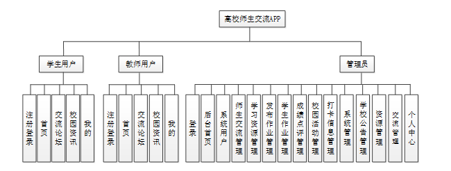 功能模块设计是系统开发过程中的重要阶段,它旨在将系统划分为不同的模块,每个模块负责完成特定的功能或任务。基于Android的高校师生交流APP由用户端学生用户、教师用户和后台管理员这三大用户功能模块组成,每个用户模块又包含具体的功能操作。系统整体功能结构图如下图4.1所示。