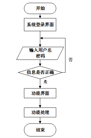 用户首先进入系统登录界面,输入用户名和密码后,系统验证信息是否正确。若验证失败,返回登录界面重新输入;若验证成功,则进入功能界面,执行相应功能处理后结束操作流程。操作流程如图3-6所示。