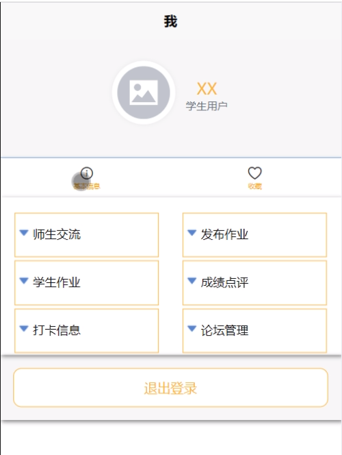 用户点击首页正下方“我的”进入页面可以查看基本信息、收藏、师生交流、发布作业、学生作业、成绩点评、打卡信息和论坛管理并进行相关操作。例如,点击“基本信息”可以修改个人资料和登录密码;点击“发布作业”可以查看列表中某个作业的详情和提交作业;点击“收藏”可以查看和删除我的收藏列表信息。我的界面如图5-8所示。