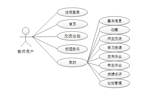 教师用户功能包括注册登录、首页、交流论坛、校园资讯、我的(基本信息、收藏、师生交流、学习资源、发布作业、学生作业、成绩点评和论坛管理)。