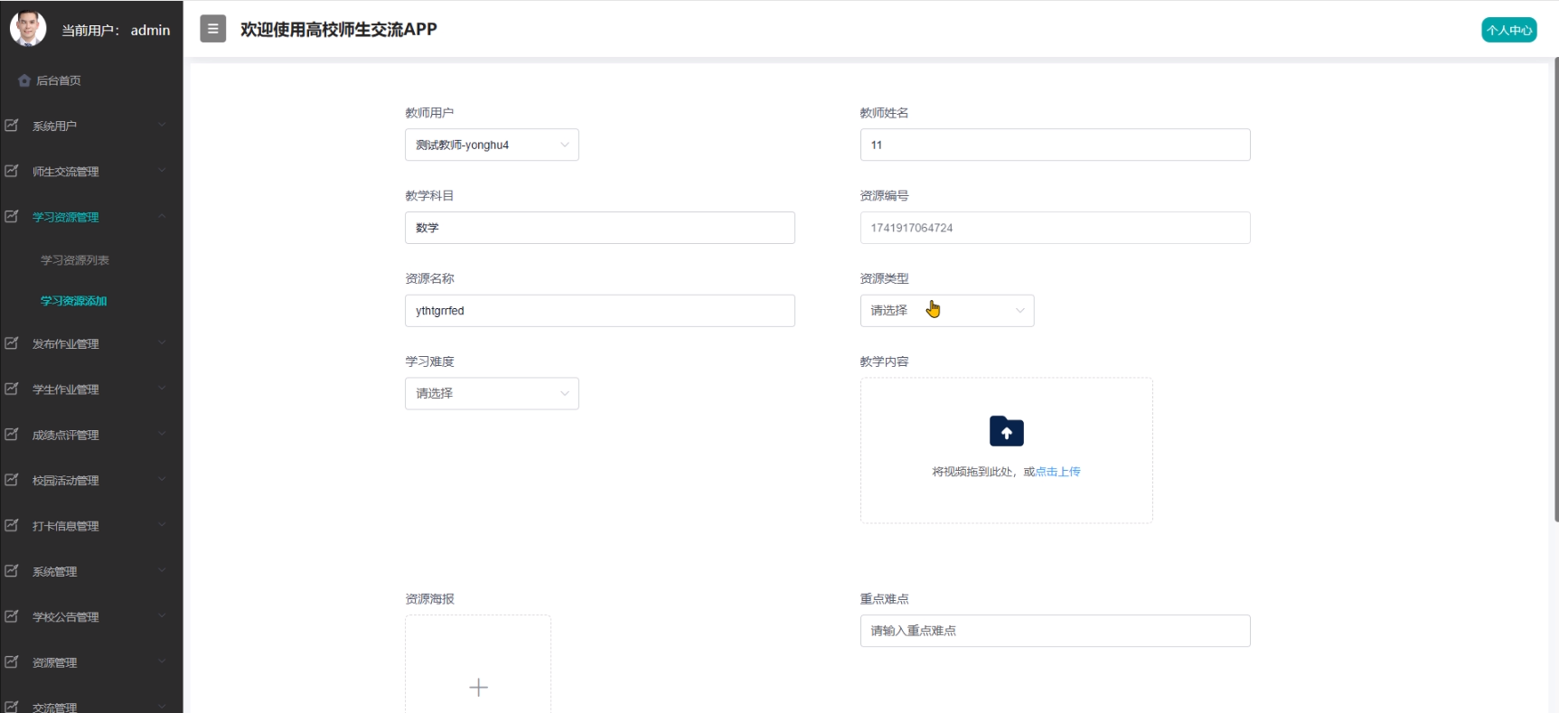 在该模块管理员可以对学习资源列表进行管理和进行学习资源添加。如点击“学习资源列表”进入页面可以查看列表中某个学习资源的详情和评论。点击“学习资源添加”进入页面填写教师用户、资源名称、学习难度等信息及上传教学内容视频和资源海报后点击“提交”即可完成学习资源的添加。以学习资源添加为例,其界面如图5-12所示。