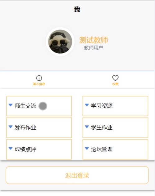 用户点击首页正下方“我的”进入页面可以查看基本信息、收藏、师生交流、学习资源、发布作业、学生作业、成绩点评和论坛管理并进行相关操作。例如,点击“基本信息”可以修改个人资料和登录密码;点击“师生交流”可以查看列表中某个学生用户提交的交流信息详情并进行回复;点击“学生作业”可以查看列表中某个学生作业的详情并进行打分点评。点击“收藏”可以查看和删除我的收藏列表信息。我的界面如图5-10所示。