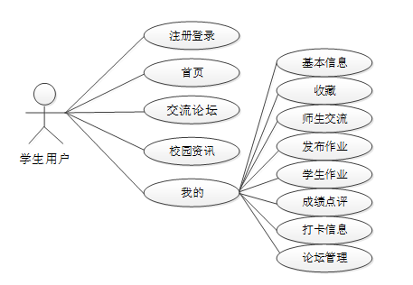 学生用户功能包括注册登录、首页、交流论坛、校园资讯、我的(基本信息、收藏、师生交流、发布作业、学生作业、成绩点评、打卡信息和论坛管理)。