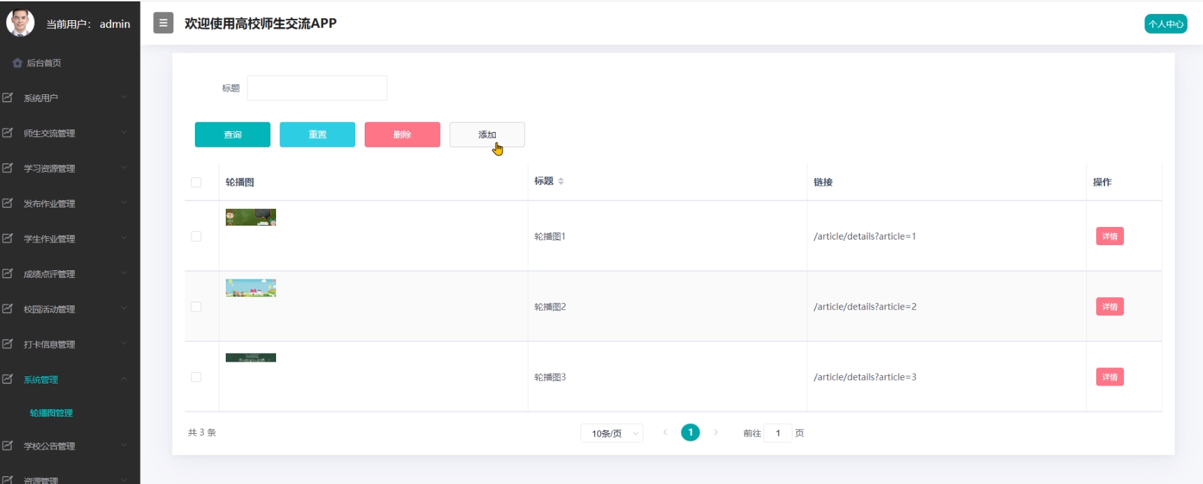 在该模块管理员可以对轮播图进行管控,可以对轮播图信息进行增删改查操作。例如,点击“轮播图管理”进入页面后点击“添加”,上传轮播图图片、输入标题、链接信息后点击“提交”即可完成轮播图的添加。其界面如图5-14所示。