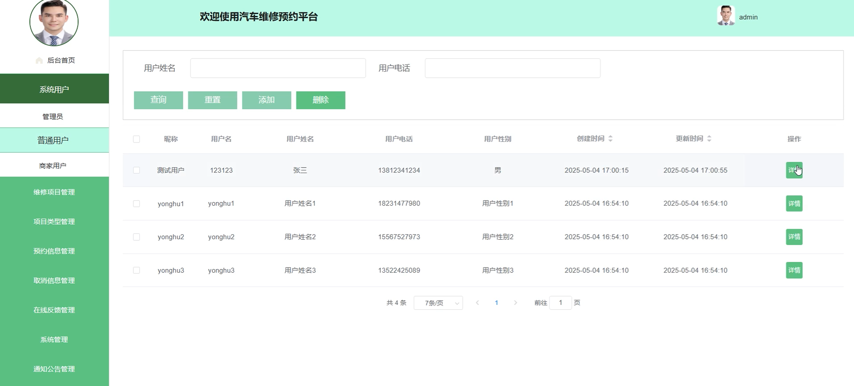普通用户可以通过平台查看维修项目、浏览汽车资讯、在线反馈问题,满足其对汽车维修服务的自主查询和预约需求;商家用户可以添加和管理维修项目、回复用户留言、与用户进行实时互动,及时掌握用户需求并提供精准服务;管理员则负责用户管理、维修项目管理、预约信息管理、在线反馈管理、通知公告管理以及资源管理等操作,确保平台的高效运行和优质服务。经过功能测试,系统各项功能运行正常,达到了预期设计目标。系统的实现为汽车维修服务提供了一个高效、便捷且用户友好的平台,显著提升了维修服务的管理效率和用户满意度。同时,系统的模块化设计和可扩展性为未来功能升级提供了便利。测试结果表明,系统在功能完整性、操作流畅性及数据安全性方面均表现良好。