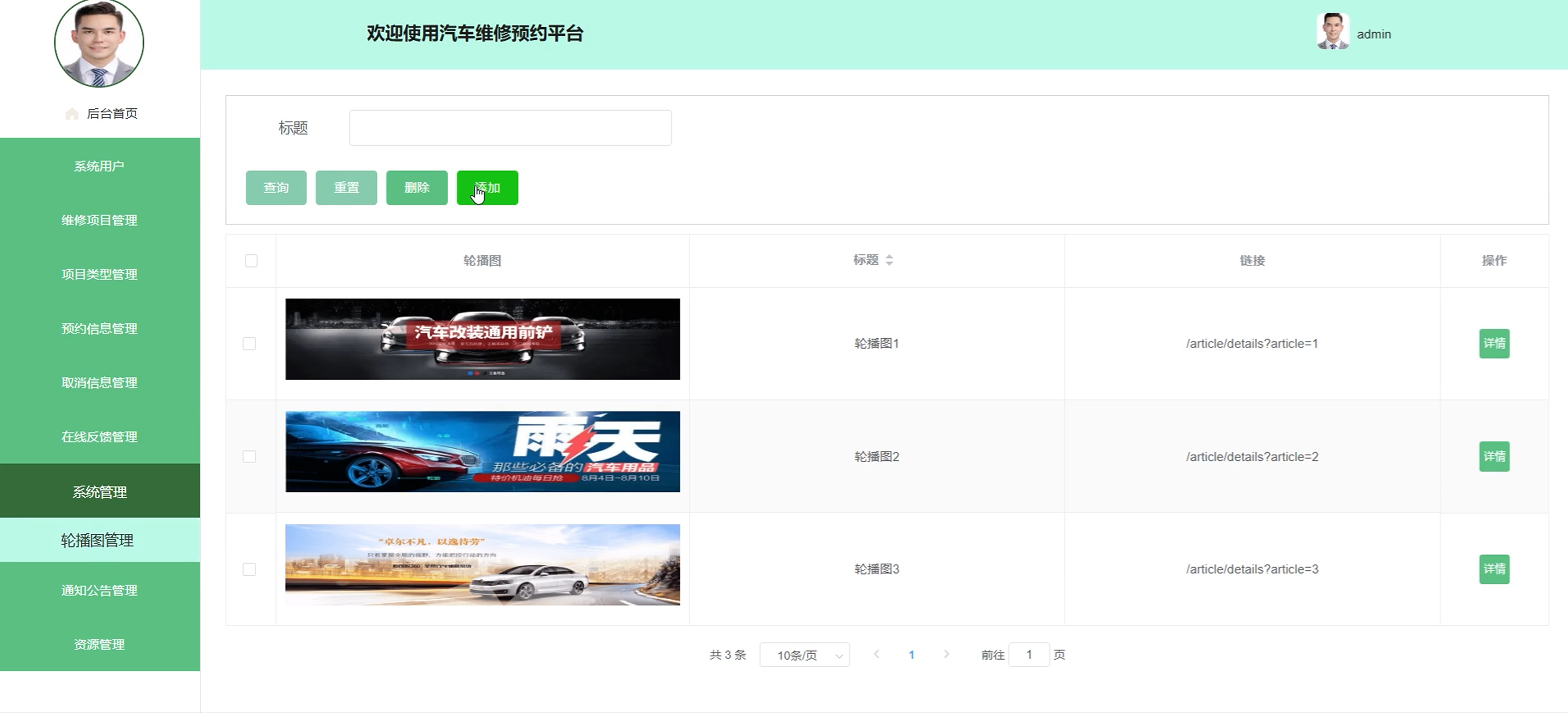 管理员可查看轮播图管理;如需添加新的轮播图,点击右侧“添加”按钮,上传图片,输入标题和链接,点击“确认”按钮进行添加,可对轮播图进行增删改查。其界面图如下。