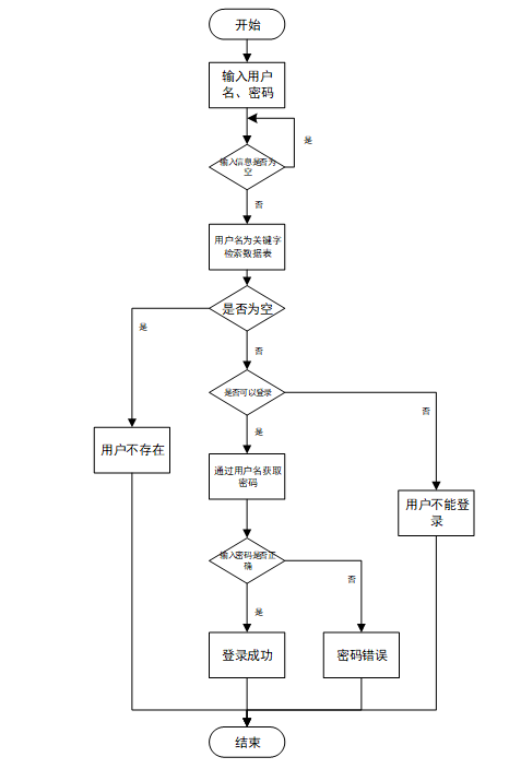 用户输入用户名和密码后,系统先检查输入是否为空,再验证用户名是否存在,若存在则通过用户名获取密码并校验。若密码正确则登录成功,否则提示密码错误。若用户名不存在或无法登录,提示用户操作无效。如图4-2所示。