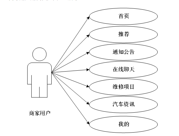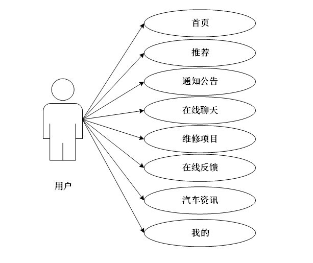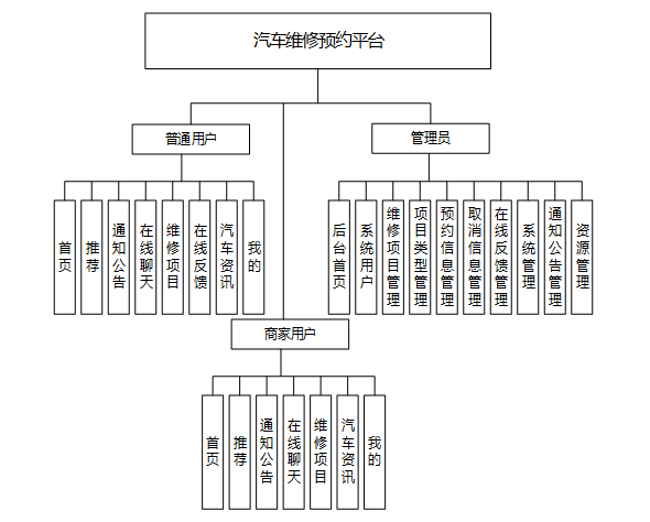 普通用户:首页、推荐、通知公告、在线聊天、维修项目、在线反馈、汽车资讯、我的(基本信息、收藏、评论、预约信息、取消信息、在线反馈)等功能。