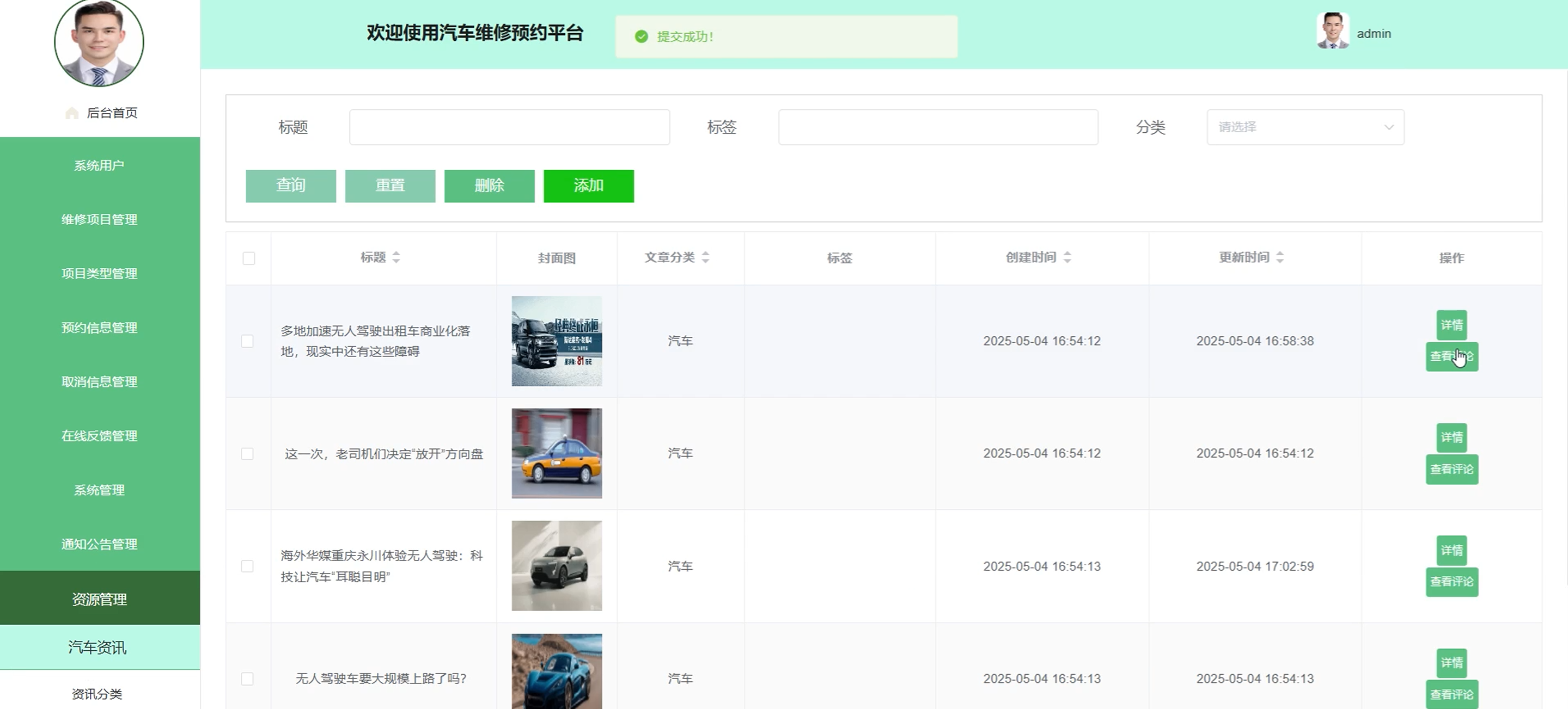 管理员可以管理平台的汽车资讯资源,包括发布、编辑和删除资讯文章,管理资讯分类,优化资讯内容的展示和分类体系,为用户提供有价值的汽车知识和行业动态。其界面图如下。