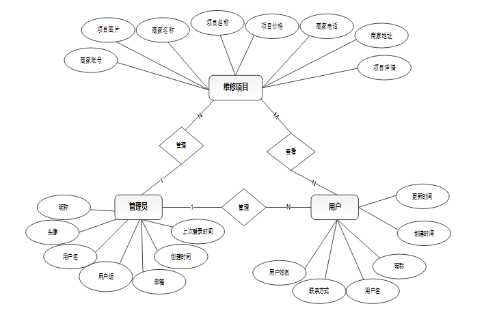 概念设计是数据库设计的第一步,其主要目标是对系统的数据需求进行全面的理解和抽象[11]。在这一阶段,通过建立实体-关系模型(ER模型)来识别系统中的关键实体、属性及其相互关系。概念设计的输出是一个清晰的ER图,作为后续数据库表设计的基础。以下将展示系统的全局E-R图以及各个实体的属性图。