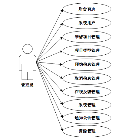 管理员:后台首页、系统用户(用户、商家用户、管理员)、维修项目管理、项目类型管理、预约信息管理、取消信息管理、在线反馈管理、系统管理(轮播图)、通知公告管理、资源管理(汽车资讯、资讯分类)等功能。