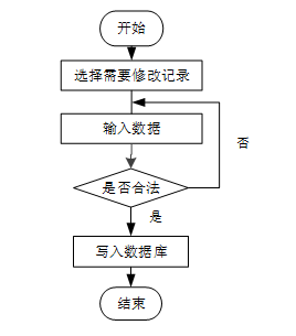 用户首先选择需要修改的记录,输入修改后的数据,系统判断输入数据是否合法。若数据不合法,提示重新输入;若数据合法,则将修改后的数据写入数据库,完成操作后流程结束。修改信息流程图如图4-4所示。