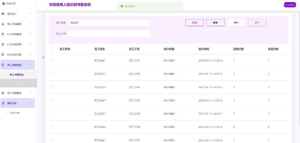 - 部门考勤管理:管理员可以管理所有的部门考勤,支持增加新的部门考勤,修改和删除现有的部门考勤,实现报表导出功能。