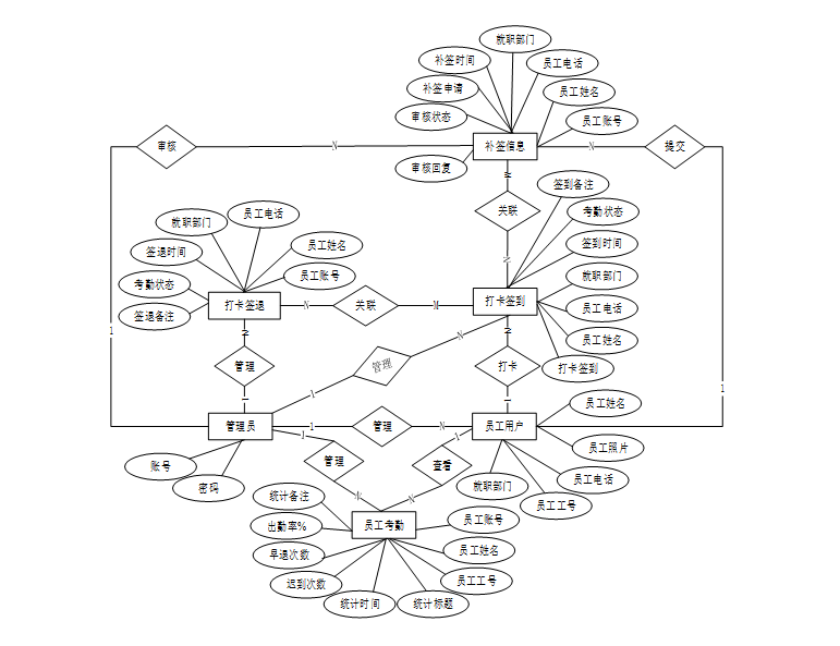 通过E-R图能够帮助用户理清系统中的数据结构和关系,为后续的数据库表结构设计提供指导。在进行数据库设计之前,首先需要先绘制实体-关系(E-R)图。E-R图将帮助理清业务中的实体(Entity)及它们之间的关系(Relationship),从而为后续的数据库表设计提供基础。根据前文可以得出本人脸识别考勤系统拥有多个实体,在此列举主要实体,各个实体之间联系总E-R图如下图所示。